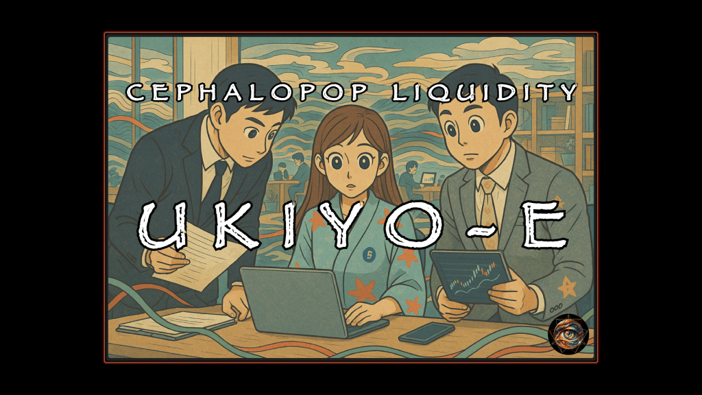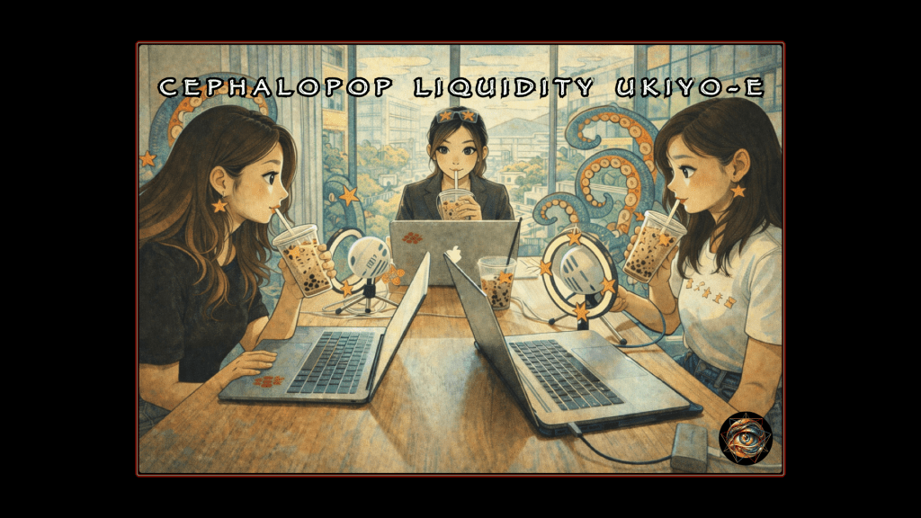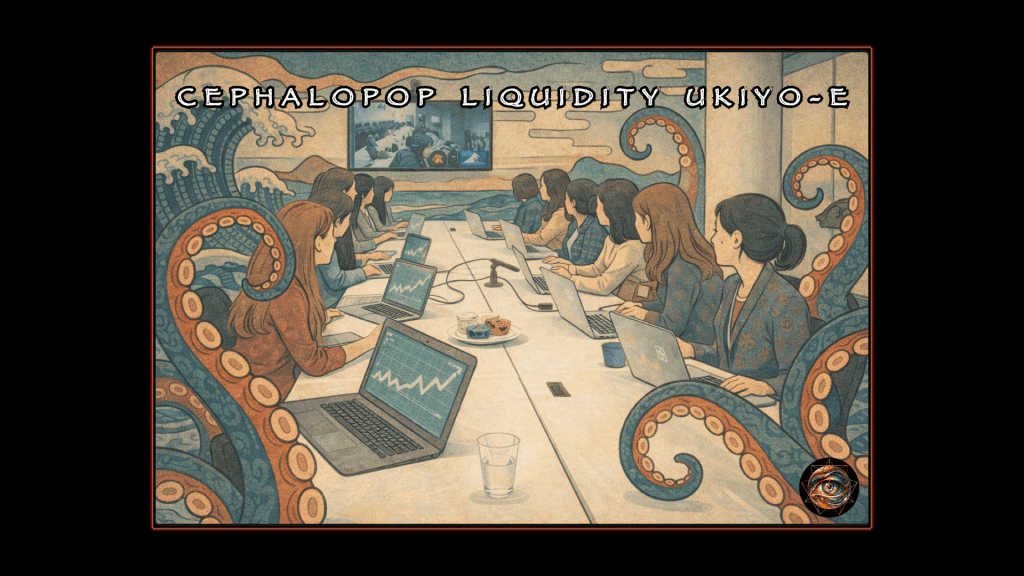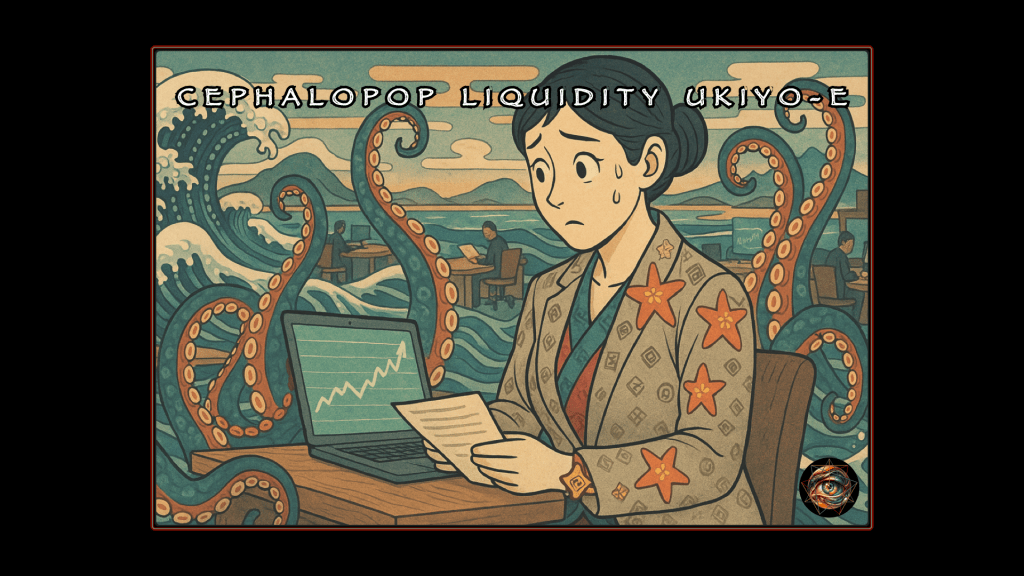 Cephalopop Liquidity Ukiyo-e sits in that profitable third category. The look does not aim for beauty. The look aims for adhesion. Modern office cosplay, crypto ornamentation, and brand-safe “girl-boss” staging get laundered through the authority scent of a faux antique Japanese print. The result reads like a late-19th-century woodblock that wandered into a Bloomberg terminal, got issued a badge, and started pretending spreadsheets were weather maps.