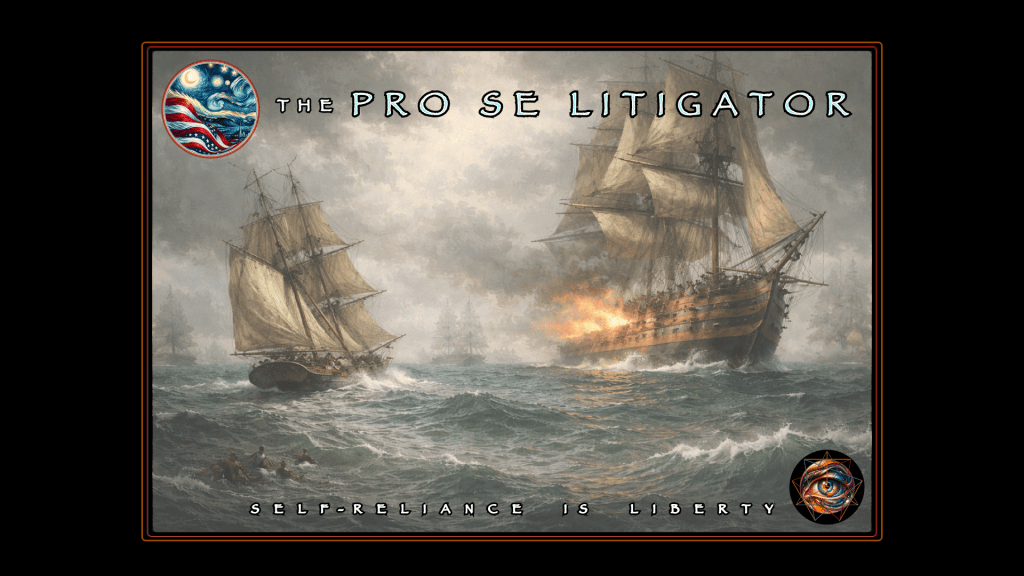 The Pro Se Litigator who remains cargo will be carried through the legal process by forces that remain invisible, deposited at a judgment shaped entirely by others. He who becomes crew still faces the same winds, the same procedural seas, the same institutional fleet bearing down with superior firepower. The difference is comprehension: knowing why the maneuvers are executed, anticipating what comes next, recognizing the tactics as they unfold.