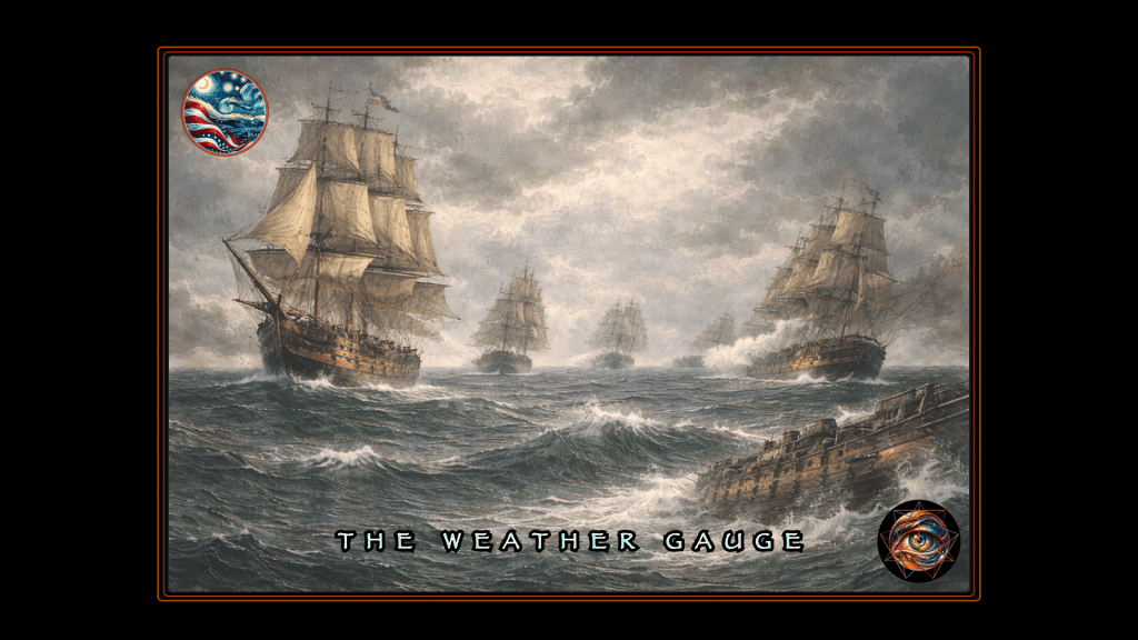 Before modern engines, the ship that held the weather gauge held the windward position relative to the enemy. This conferred a decisive advantage: the windward ship chose when to engage, at what distance, and on what terms. Her crew worked the guns on a level deck while the leeward ship heeled away from them, her gunners firing uphill, her lower ports closed against the sea that sloshed through the scuppers. The windward captain could close to pistol range or stand off and punish with long guns; the leeward captain could only receive what was given. A captain who surrendered the weather gauge surrendered initiative; he would fight when and where his opponent chose, on a tilted deck, half-blinded by spray.