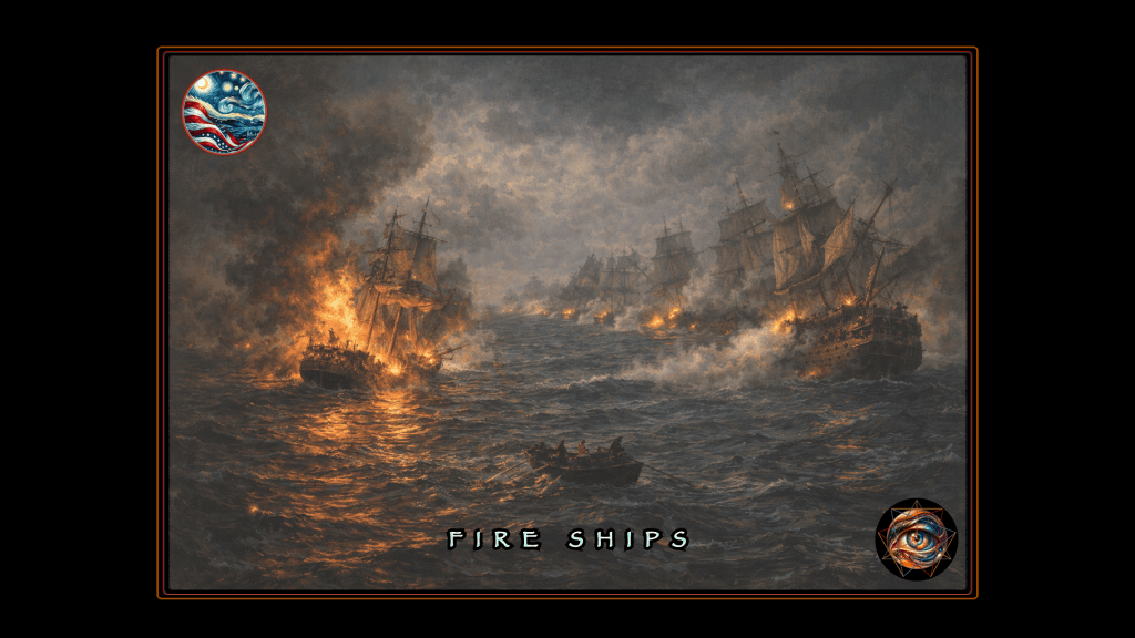 The fire ship was a sacrificial weapon, a vessel already condemned. Her crew would load her hold with tar, pitch, faggots of dry wood, and hemp rope soaked in turpentine. They would sail her toward the enemy fleet at night, skeleton crew at the helm, timing their escape to the last possible moment. At the right distance they would light the fuses, leap into a trailing longboat, and row hard for safety while flames climbed the ratlines behind them. At the Battle of the Basque Roads in 1809, Lord Cochrane sent fire ships and explosion vessels against the French fleet anchored in the Aix Roads. The French captains panicked, cut their anchor cables, and ran aground in the darkness. Only four French ships remained in navigable water by morning. The fire ships themselves destroyed almost nothing directly; their value was in the chaos they provoked, the documentation they forced, the courts-martial that followed for French officers who had abandoned their posts.