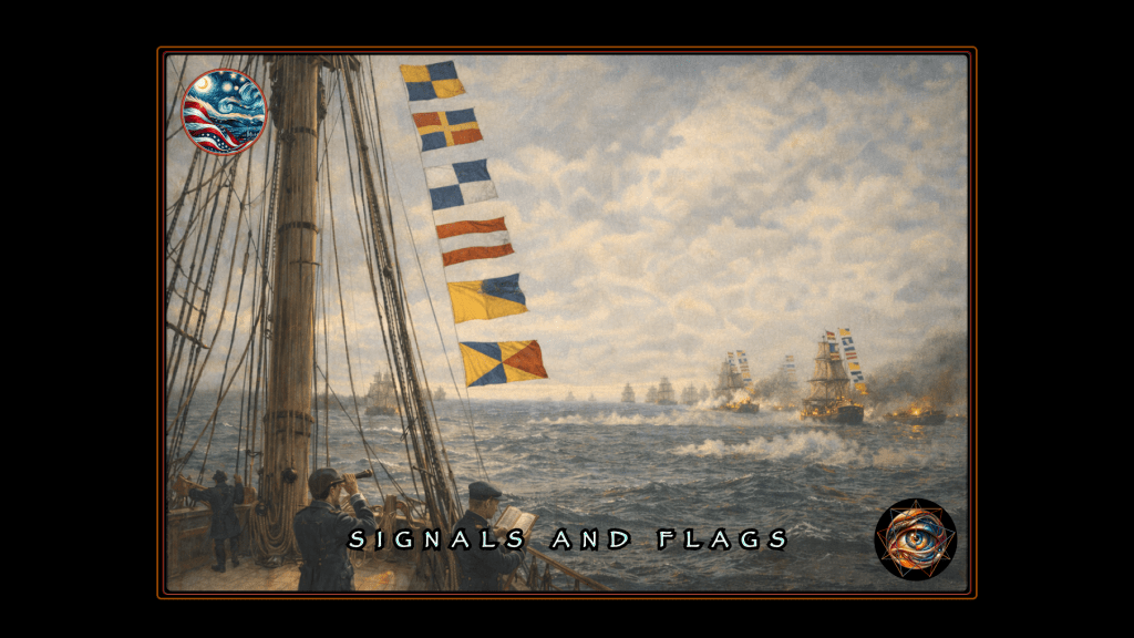 Naval communication in the Early Modern era depended on signal flags, a constrained vocabulary of colored pennants that could be read across miles of ocean. The signal book contained hundreds of predefined messages, but no provision for nuance. Captain Home Popham’s Telegraphic Signals of 1800 expanded the vocabulary, yet even Popham’s system had limits. At Trafalgar, Nelson wished to signal “England confides that every man will do his duty,” but “confides” was not in the book; it would have to be spelled letter by letter, costing time the fleet did not have. The signal that flew instead used “expects,” which was in the vocabulary. The message that reached the fleet was not quite what Nelson intended, but it was clear. Clarity was survival. A misread signal could send a ship in the wrong direction, expose a flank, lose an engagement. The flag that flew was the only message that existed.