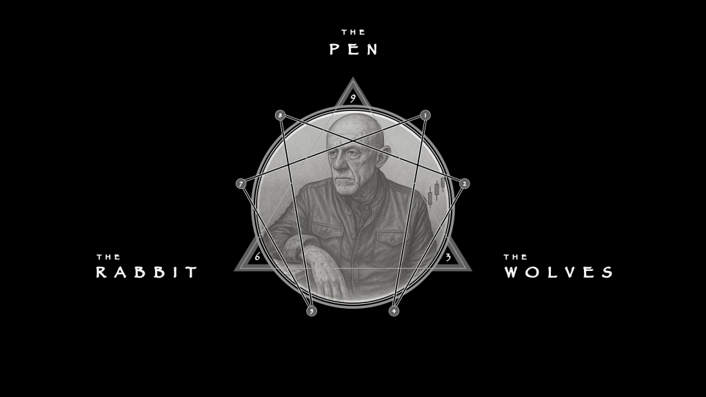 The game unfolds on a standard 8×8 checkers board renamed “the Pen”, whose 64 squares represent the confined space within which the strategic drama between predators and prey plays out. At one end of the Pen, the Four Black Wolves line up on the dark squares of the back row, poised to strike. Opposite them, a lone White Rabbit contemplates its perilous path, readying to run the gauntlet.